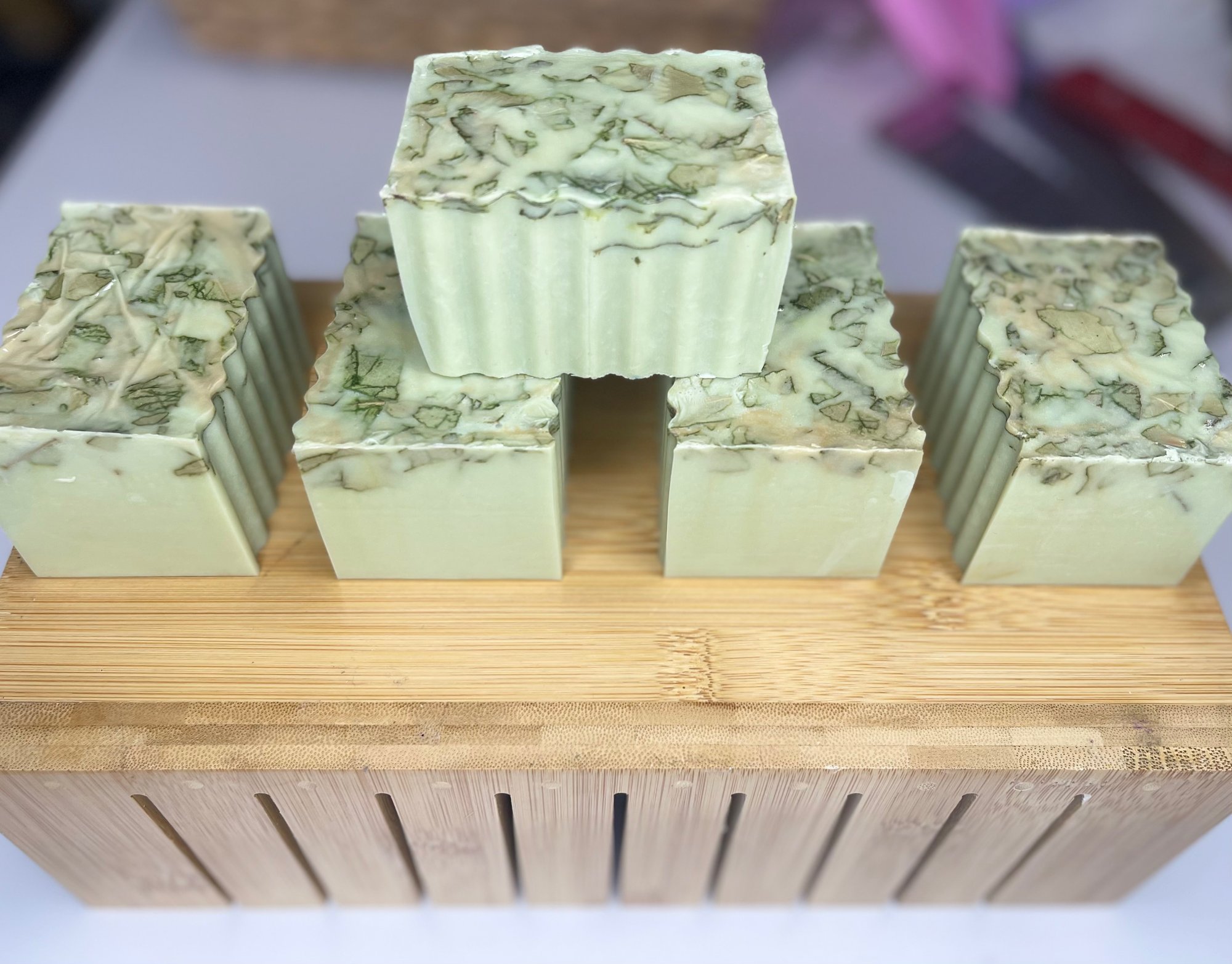 Triple Butter Soap (Mango, Shea, Cocoa) with eucalyptus, vitamin e, and pumpkin seed oils and eucalyptus leaves.